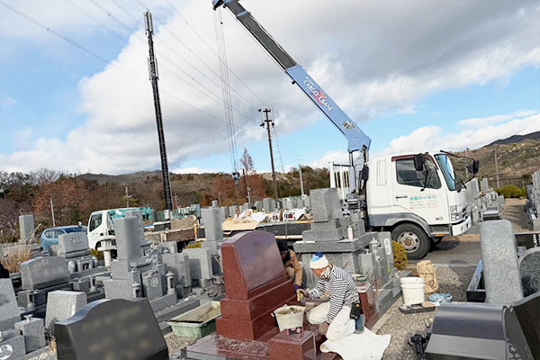 存在感のある大きな墓石のため、安全面にも十分配慮し、慎重に作業を行いました。長尾山霊園での墓石建立をご検討の方は西村石材店(宝塚市)までお気軽にご相談ください。